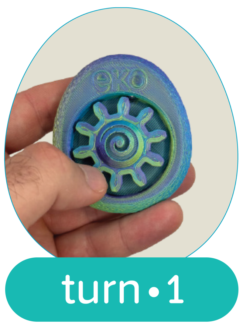 how to twirl - place the eko base in the palm of your hand with the word ‘eko’ facing downwards. Place the flat side of the gear on the bottom of the base. Start twirling!
