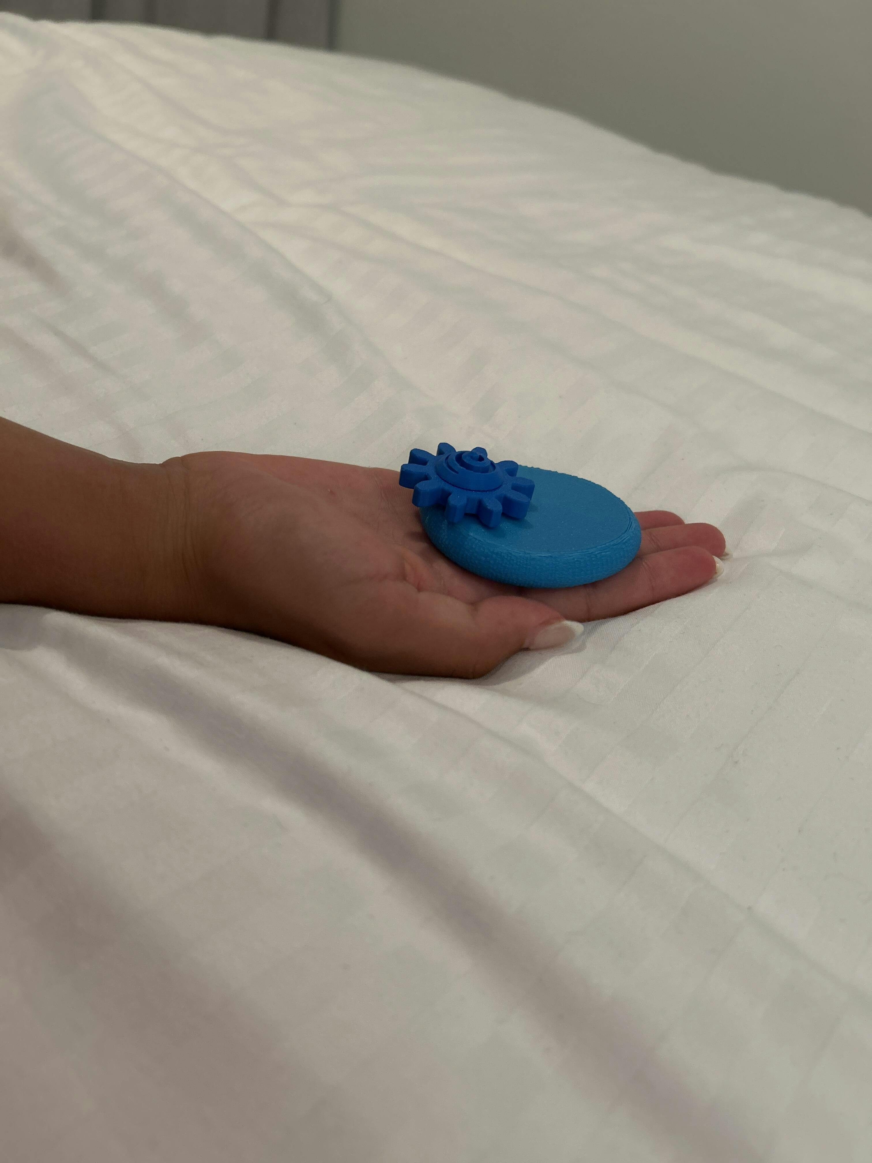 breath 2 - turn the base, so that the bottom of the base is facing up. Place your index finger and your middle finger on the bottom of the base and your thumb on the 'eko' logo. To keep the gear spinning continuously, blow on the side of the teeth where the teeth hits the bottom of the base, hold the base close to your mouth and blow gently let it spin. Try counting 1-2-3 when inhaling, then hold 1-2-3 and exhale 1-2-3, and repeat this until you start feeling relaxed and more present in the moment